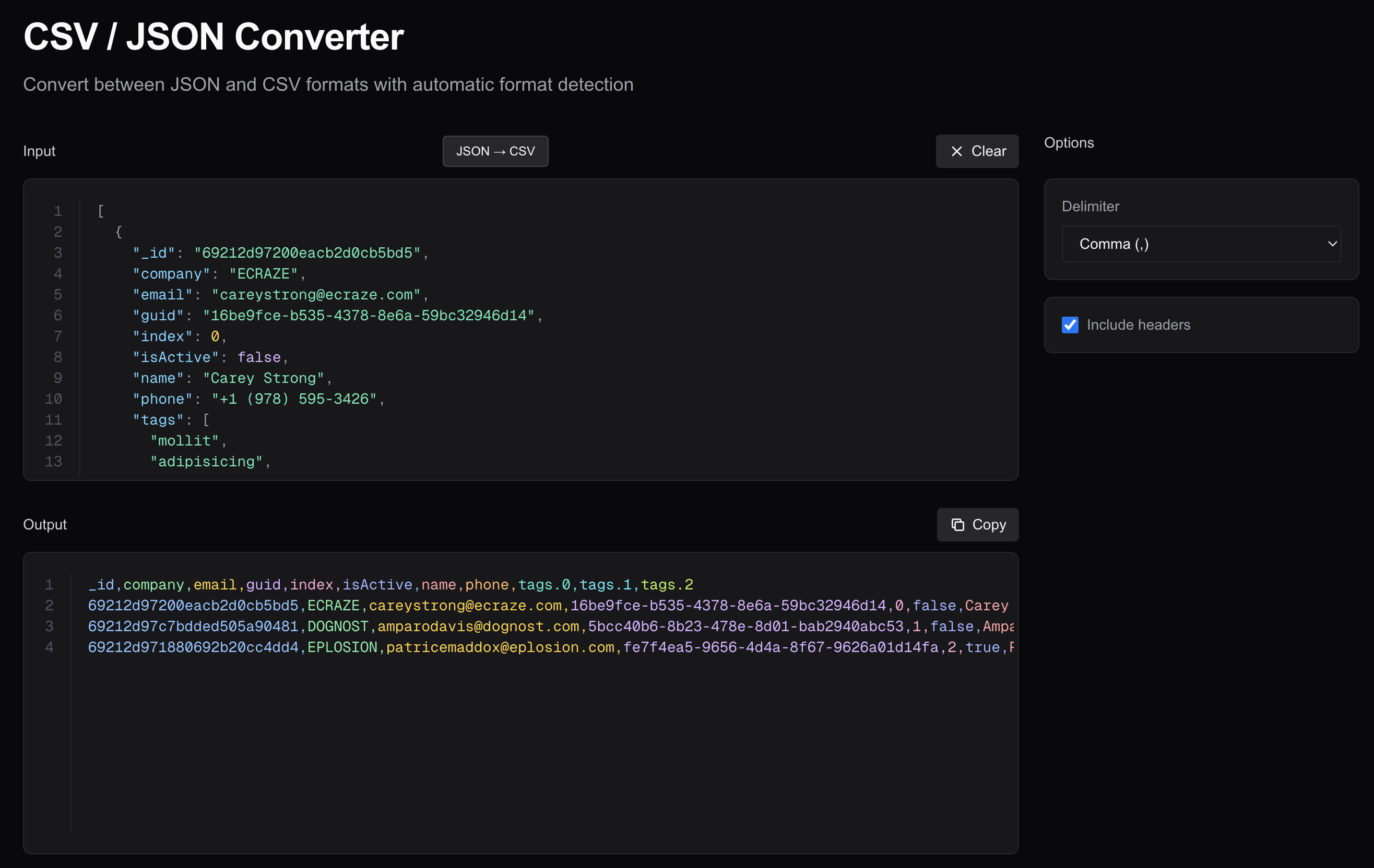 - CSV / JSON Converter — convert between CSV and JSON with proper parsing and type detection.