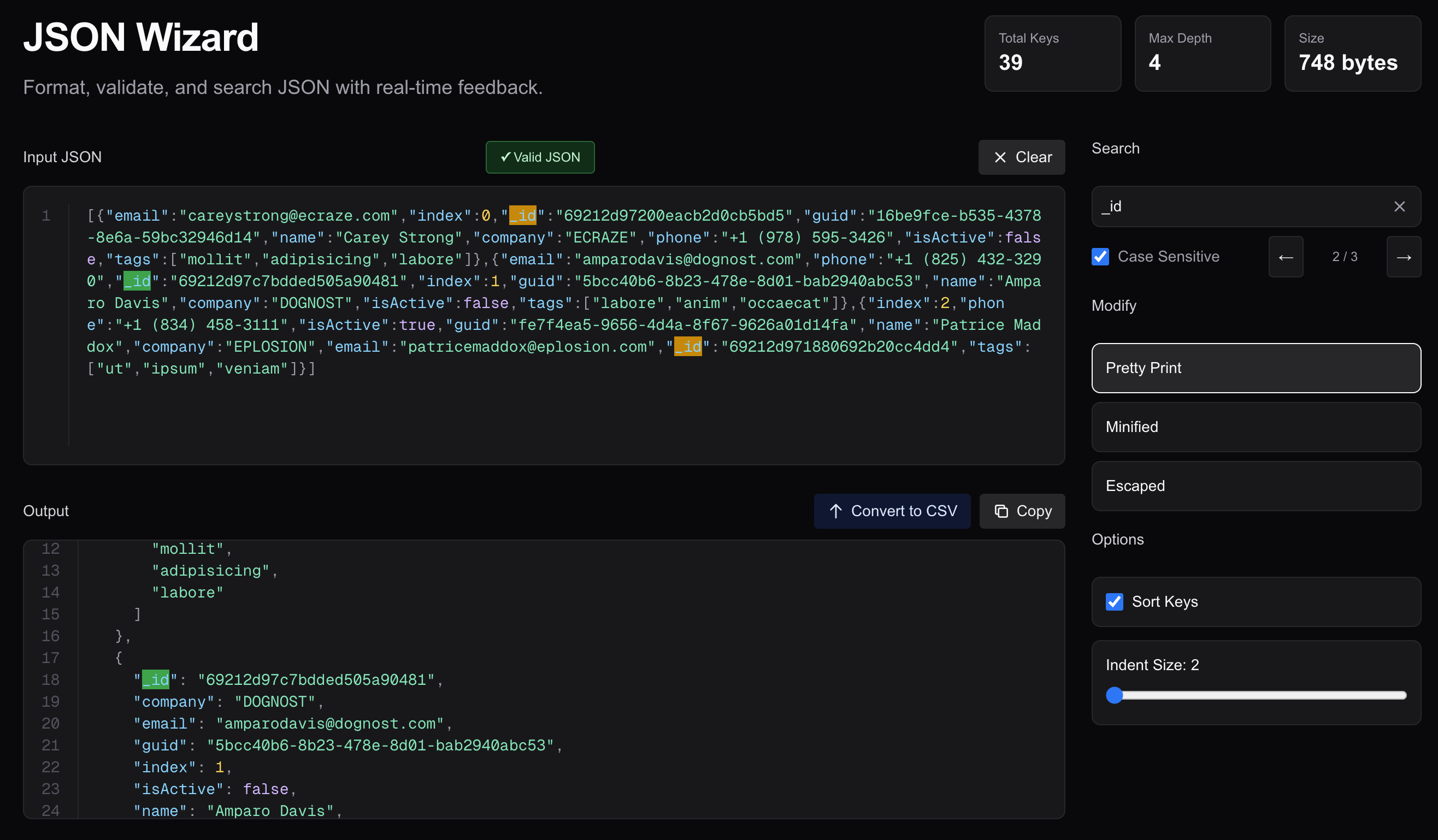 - JSON Wizard — validate, pretty-print, search, and manipulate JSON with real-time feedback.